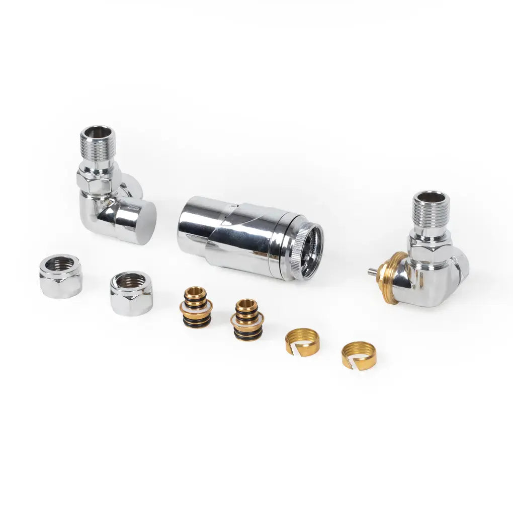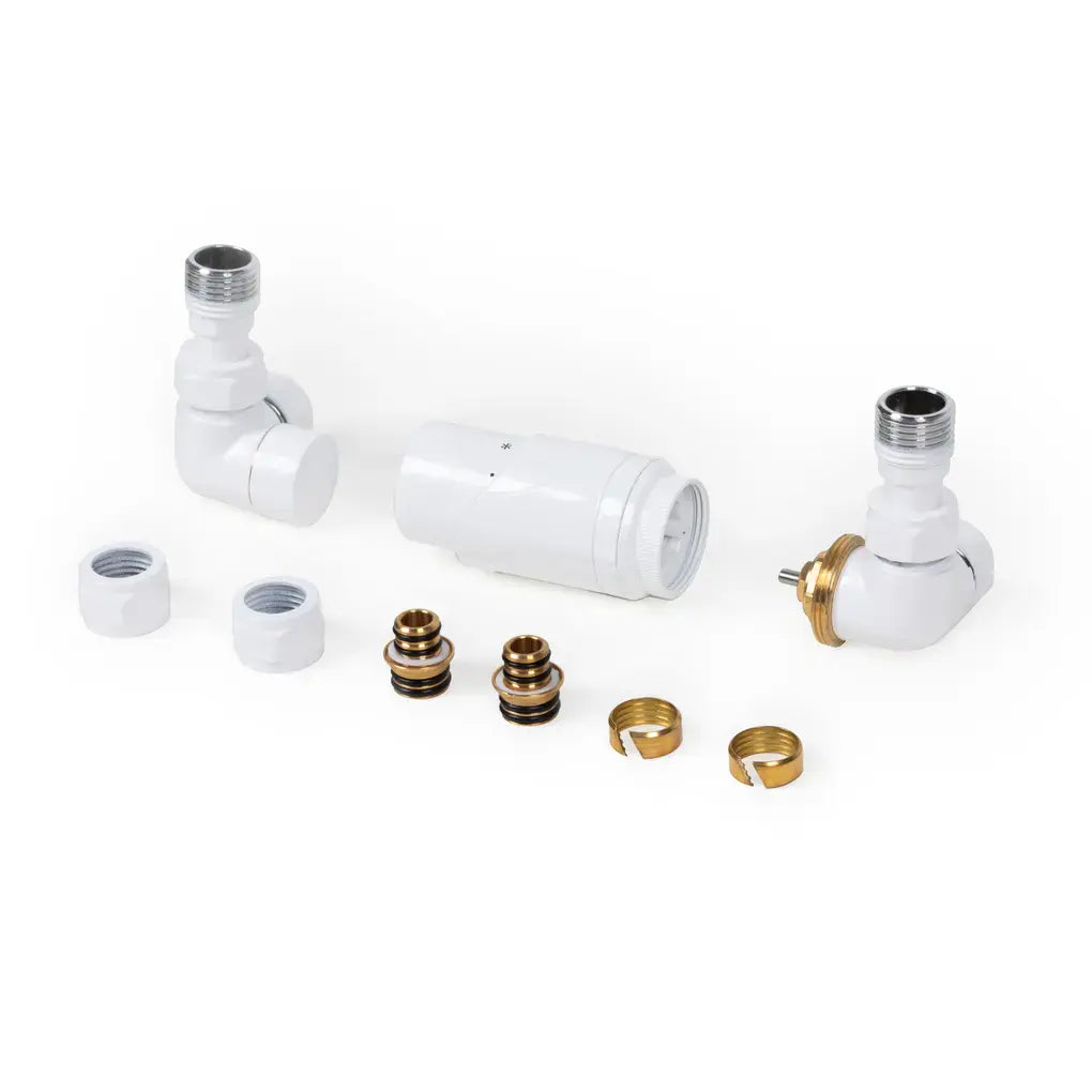 Zestaw termostatyczny z głowicą, trójosiowy. GZ 1/2''. Złączki CU/PEX. Kolory biały, chrom, czarny.